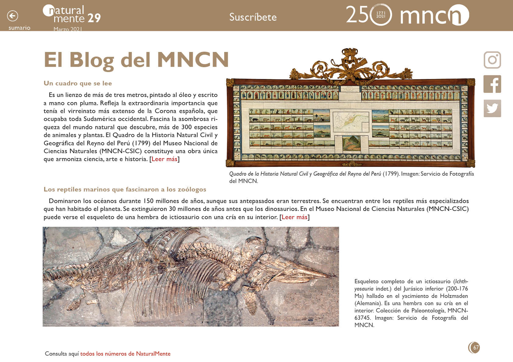 Blog del MNCN Entradas del Blog del MNCN publicadas entre el 15 de diciembre de 2020 y el 15 de marzo de 2021. Publicado en NaturalMente 29 Autor Carmen Martínez Documentación Blog del MNCN en NaturalMente 29 Te podría interesar Un cuadro que se lee Los reptiles marinos que fascinaron a los zoólogos Contacto