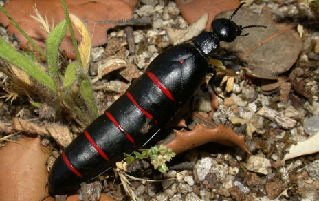 Estos coleópteros de la familia Meloidae, al igual que otros de la misma familia, son capaces de sintetizar cantaridina, un veneno muy tóxico al que se le atribuyen propiedades medicinales e incluso afrodisiacas, lo que ha provocado muertes en los países donde vive la familia. Dado que habitualmente el color rojo en los insectos indica que éstos son venenosos, los investigadores han querido comprobar si la coloración en esta especie ha evolucionado junto con la producción de veneno, de forma que las rayas rojas fueran una señal de advertencia para evitar el ataque de depredadores.