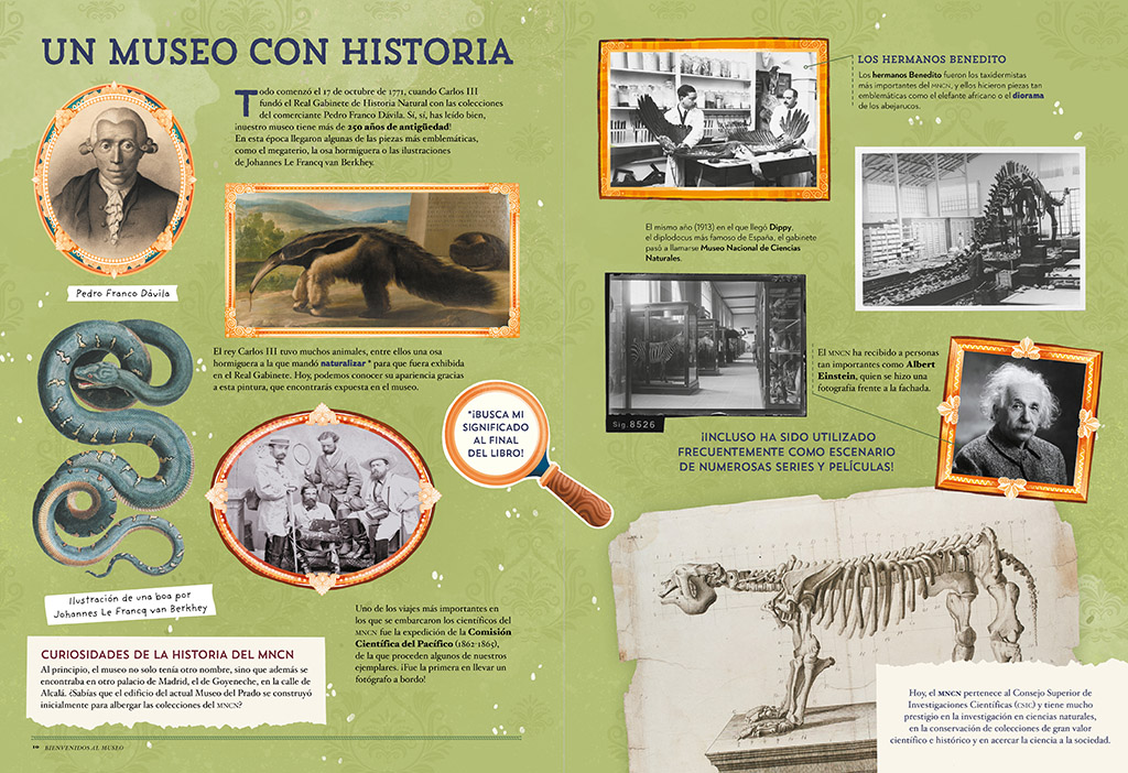 El contenido, que ha sido creado desde la Vicedirección de Comunicación de Cultura Científica del MNCN por Marta Fernández y Azucena López con el asesoramiento de Marta Yustos y la supervisión de la editorial B de Blok, ha contado con el apoyo de diversas colecciones del Museo, así como de su Archivo y Biblioteca. Los textos cobran vida a través de láminas históricas, de fotografías de alta calidad y de las detalladas ilustraciones llenas de color de Diego R. Robredo. “En un álbum ilustrado la imagen es fundamental. Dibujar las especies y los conceptos que se incluyen en el libro ha sido un reto y un privilegio, pero también ha sido una experiencia muy divertida y estimulante al tratarse de una institución con más de 250 años de historia”, señala el ilustrador.