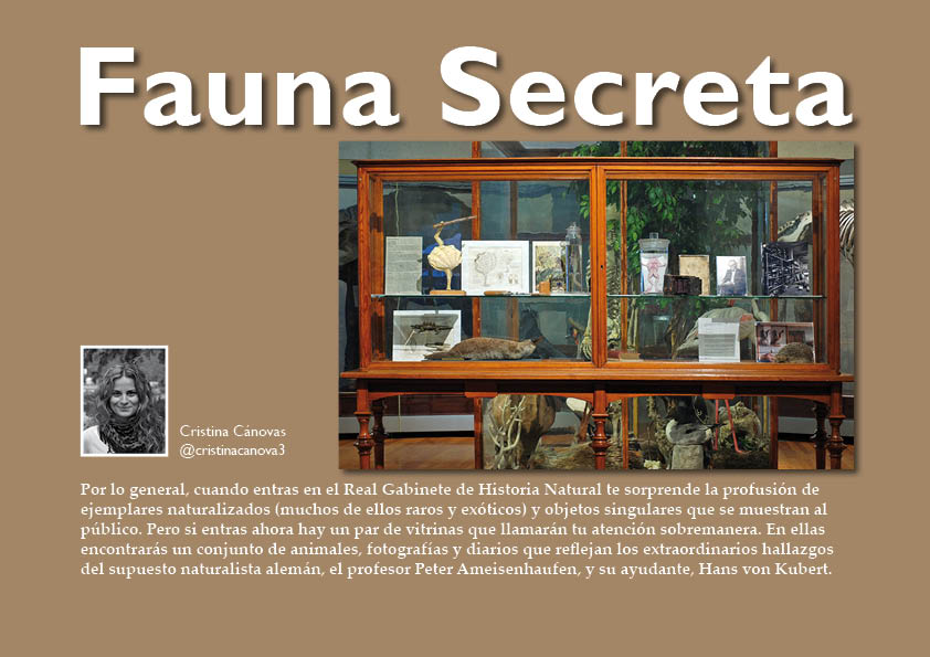 Por lo general, cuando entras en el Real Gabinete de Historia Natural te sorprende la profusión de ejemplares naturalizados (muchos de ellos raros y exóticos) y objetos singulares que se muestran al público. Pero si entras ahora hay un par de vitrinas que llamarán tu atención sobremanera. En ellas encontrarás un conjunto de animales, fotografías y diarios que reflejan los extraordinarios hallazgos del supuesto naturalista alemán, el profesor Peter Ameisenhaufen, y su ayudante, Hans von Kubert.