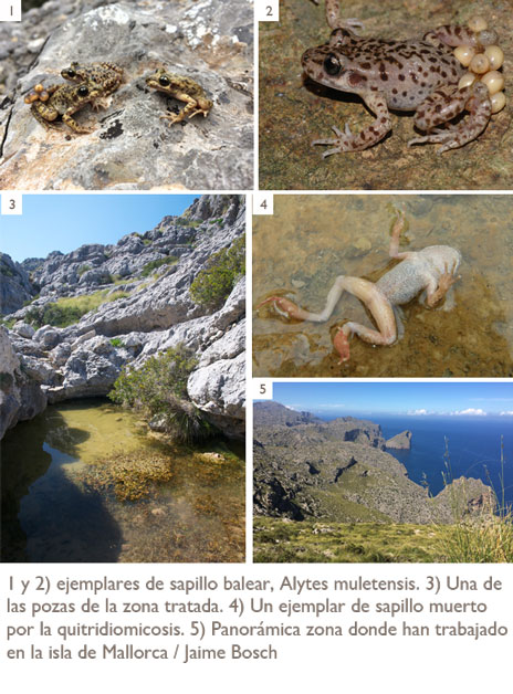 Para erradicar la presencia del hongo han aplicado tratamientos antifúngicos a los renacuajos de sapillo partero balear, Alytes muletensis, especie endémica de la isla de Mallorca, y desinfectado el medio natural. 'La combinación del tratamiento de los renacuajos con una descontaminación del ambiente ha logrado erradicar la infección de poblaciones de sapillo balear, aparentemente, de forma permanente' explica Jaime Bosch, investigador del MNCN.