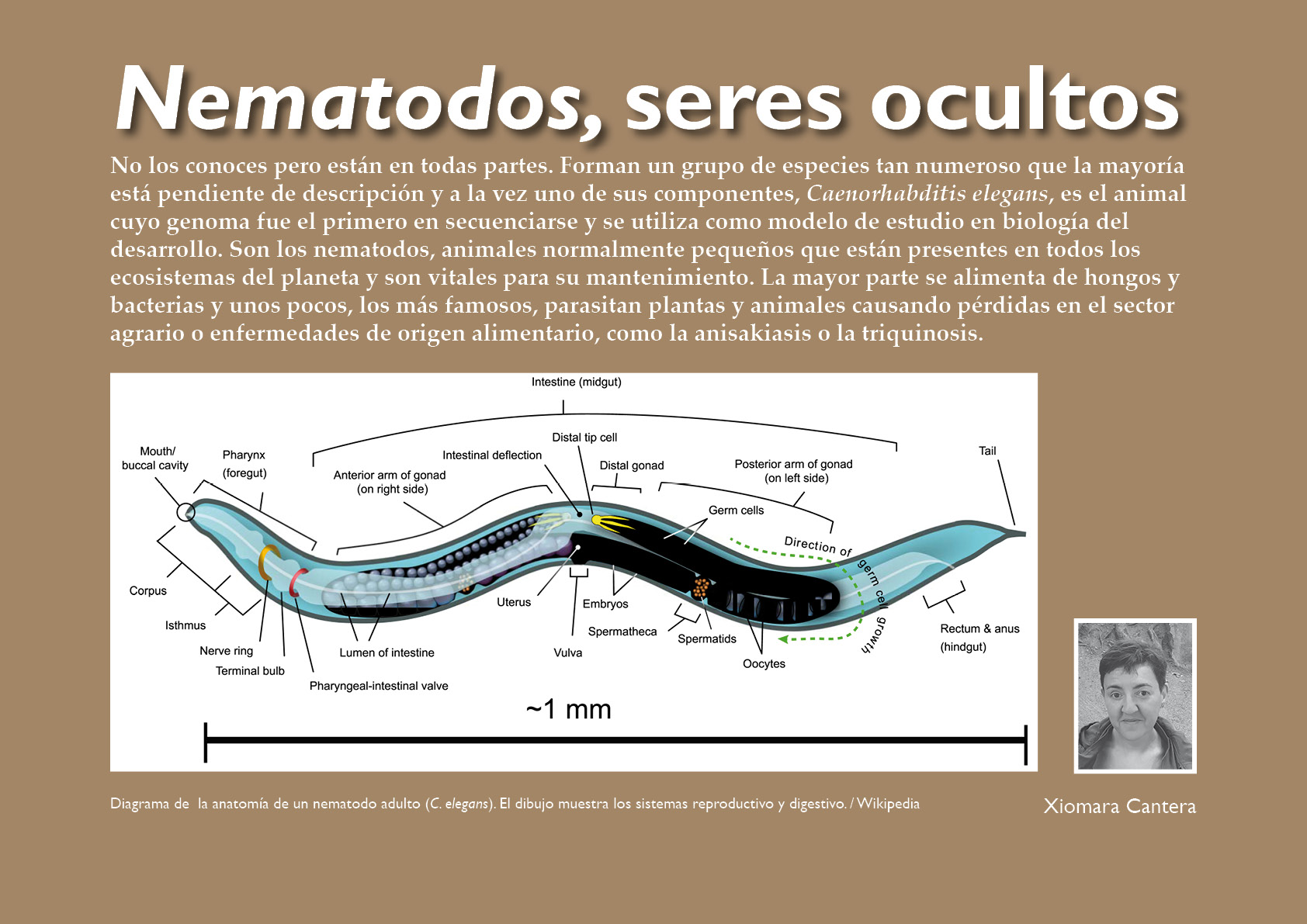 No los conoces pero están en todas partes. Forman un grupo de especies tan numeroso que la mayoría está pendiente de descripción y a la vez uno de sus componentes, Caenorhabditis elegans, es el animal cuyo genoma fue el primero en secuenciarse y se utiliza como modelo de estudio en biología del desarrollo. Son los nematodos, animales normalmente pequeños que están presentes en todos los ecosistemas del planeta y son vitales para su mantenimiento. La mayor parte se alimenta de hongos y bacterias y unos pocos, los más famosos, parasitan plantas y animales causando pérdidas en el sector agrario o enfermedades de origen alimentario, como la anisakiasis o la triquinosis.