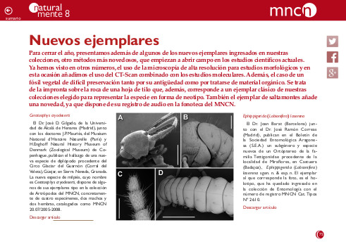 Para cerrar el año 2015, presentamos además de algunos de los nuevos ejemplares ingresados en nuestras colecciones, otro métodos más novedosos, que empiezan a abrir campo en los estudios científicos actuales. Ya hemos visto en otros números el uso de la microscopía de alta resolución para estudios morfológicos y en esta ocasión añadimos el uso del CT-Scan combinado con los estudios moleculares. Además, el caso de un fósil vegetal de difícil preservación tanto por su antigüedad como por tratarse de material orgánico. Se trata de la impronta sobre la roca de una hoja de tilo que, además, corresponde a un ejemplar clásico de nuestras colecciones elegido para representar la especie en forma de neotipo. También el ejemplar de saltamontes añade una novedad, ya que dispone de su registro de audio en la fonoteca del MNCN.