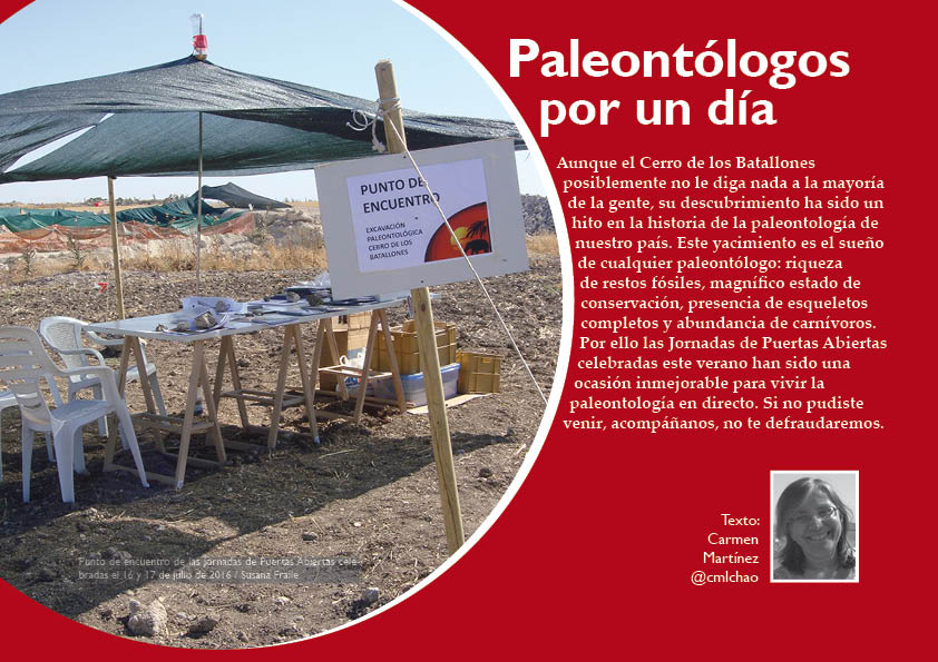 Aunque el Cerro de los Batallones posiblemente no le diga nada a la mayoría de la gente, su descubrimiento ha sido un hito en la historia de la paleontología de nuestro país. Este yacimiento es el sueño de cualquier paleontólogo: riqueza de restos fósiles, magnífico estado de conservación, presencia de esqueletos completos y abundancia de carnívoros. Por ello las Jornadas de Puertas Abiertas celebradas este verano han sido una ocasión inmejorable para vivir la paleontología en directo. Si no pudiste venir, acompáñanos, no te defraudaremos.