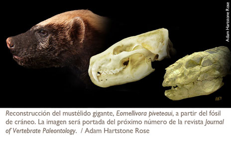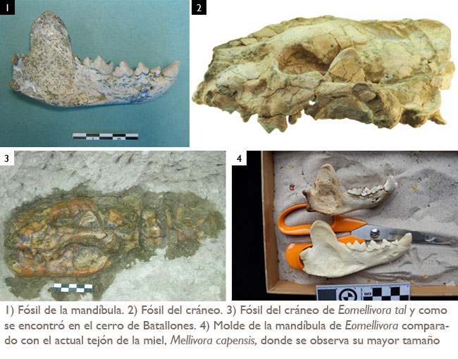 Un equipo multidisciplinar de investigadores ha descrito los primeros fósiles craneales de una especie de depredador carnívoro de hace nueve millones de años. En concreto, han descrito el cráneo y la mandíbula más completos del mustélido gigante Eomellivora piveteaui encontrados en el Cerro de los Batallones (Madrid). El buen estado de los fósiles ha permitido hacer un estudio de las relaciones de parentesco que demuestra, por un lado, la existencia de cuatro especies dentro del género Eomellivora y, por otro, que el pariente vivo más cercano de Eomellivora es el actual tejón de la miel, Mellivora capensis.