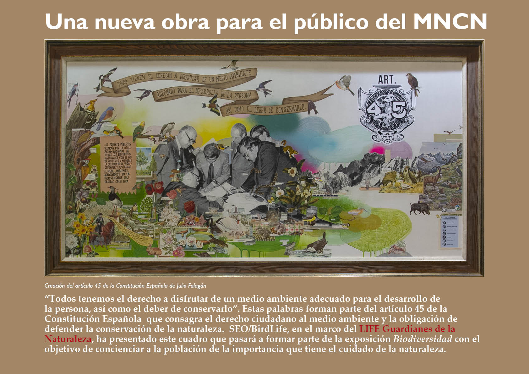 “Todos tenemos el derecho a disfrutar de un medio ambiente adecuado para el desarrollo de la persona, así como el deber de conservarlo”. Estas palabras forman parte del artículo 45 de la Constitución Española que consagra el derecho ciudadano al medio ambiente y la obligación de defender la conservación de la naturaleza. SEO/BirdLife, en el marco del LIFE Guardianes de la Naturaleza, ha presentado este cuadro que pasará a formar parte de la exposición Biodiversidad con el objetivo de concienciar a la población de la importancia que tiene el cuidado de la naturaleza.