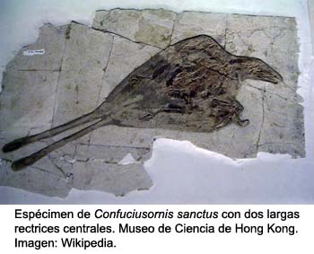 Confuciusornis vivió hace unos 120 millones de años en lo que hoy es China. Tenía el tamaño de una paloma y fue una de las aves voladoras más primitivas. El hallazgo de cientos de especímenes excelentemente conservados ha revolucionado la paleontología de las aves, permitiendo avanzar en el estudio de su historia evolutiva. El Museo Nacional de Ciencias Naturales (MNCN-CSIC) exhibe un magnífico ejemplar.