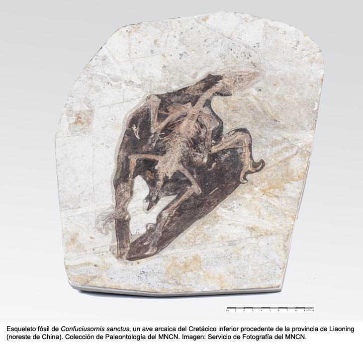 En la exposición de Minerales, fósiles y evolución Humana del MNCN puede verse un ejemplar de la especie Confuciusornis sanctus procedente de la provincia de Liaoning (noreste de China), donado por la Fundación 'la Caixa'.