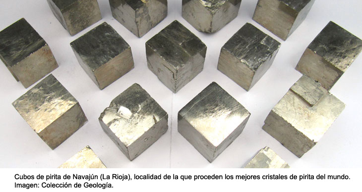 Fue el primer mineral codiciado por los antiguos buscadores de oro. La pirita está ligada al origen de la cultura humana. En Río Tinto (Huelva) se da una de las mayores concentraciones de pirita del mundo y en Navajún (La Rioja) se encuentran los mejores cristales cúbicos. El Museo Nacional de Ciencias Naturales (MNCN-CSIC) conserva una importante colección de piritas de los mejores yacimientos y en la exposición de Minerales se exhiben algunos de los ejemplares más bellos.