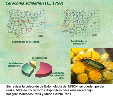 Pero ¿qué pueden aportar las colecciones científicas al conocimiento de la biodiversidad? A esta pregunta responde el actual vicedirector de colecciones del MNCN. Las colecciones nos aportan datos sobre la distribución geográfica de las especies en el pasado, que podemos comparar con la distribución actual, y así documentar la desaparición de poblaciones o su extinción. Cita como ejemplo algunas especies de escarabajos, en las que si sólo se tienen en cuenta los registros bibliográficos y no se consulta la colección del MNCN se pierden hasta el 50% de las localidades en las que están o estuvieron presentes. También señala que el déficit actual de taxónomos dificulta la adopción de medidas adecuadas para la conservación de la biodiversidad, ya que existe un número muy elevado de especies sin describir. Las colecciones son importantes, concluye, porque conservan la información que ya no está o estará disponible en el campo.