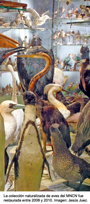 Entre las colecciones con mayor visibilidad se encuentra la colección de Aves. En los últimos diecisiete años esta colección ha sufrido distintos cambios que han culminado con su segregación de la colección de Mamíferos en 2013. La colección naturalizada fue restaurada entre 2008 y 2010, y ha sido utilizada en la renovación de las exposiciones del Museo. Con la entrada de nuevo material (10.024 ejemplares), la gran mayoría por donaciones, ha habido cambios en la composición taxonómica y en la procedencia geográfica de los ejemplares, así como en la implementación de nuevos tipos de conservación como la liofilización y la preservación de tejidos y ADN. También han mejorado los sistemas de gestión y almacenamiento de especímenes.