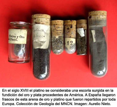 En el siglo XVIII el platino se consideraba una escoria surgida en el proceso de fundición del oro y la plata procedente de América. Se le denominaba oro blanco o platina de río Pinto (Colombia) y fue descubierta en 1748 por Antonio de Ulloa. Platina era un término despectivo que hacía alusión a una plata menos valiosa que se usaba para adulterar el oro de las ricas arenas de los ríos del Chocó (Colombia). A España llegaron frascos de esta arena de oro y platino que fueron repartidos por toda Europa, uno de los cuales se expone en el Museo. En 1784 el químico francés Chabaneau que trabajaba en Real Seminario de Vergara (Guipúzcoa) anunció que había purificado las arenas platiníferas del Choco y que había hecho una pequeña barra de platino puro. Posteriormente, Carlos III ordenó que el proceso se mantuviera en secreto y fundó la Casa de la Platina para producir objetos de platino, lo que no impidió que el químico inglés Wollaston se atribuyera su descubrimiento en la Inglaterra del siglo XIX.