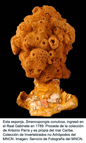 Una de las colecciones más interesantes del MNCN es la colección histórica de esponjas que reúne más de 700 ejemplares y 140 especies. Las esponjas proceden de tres etapas diferentes en la historia del Museo: el Real Gabinete de Historia Natural (1771-1815), la última década del siglo XIX y la época de Ignacio Bolívar (1901-1939). De la primera época tenemos localizados 65 ejemplares, 45 de los cuales pertenecen a la colección de Pedro Franco Dávila, o entraron en la época en la que dirigió el Real Gabinete. Trece de las esponjas pertenecen a la colección de Antonio Parra, un súbdito portugués asentado en Cuba a mediados del siglo XVIII que recolectaba todo tipo de producciones marinas, principalmente ictiofauna; su colección ingresó en 1789 en el Real Gabinete. Llaman la atención las peanas, tipo rococó o rocalla, que eran típicas de la época: son de madera a la que se han adherido distintos organismos, sobre todo pequeños corales y moluscos. Siete de las esponjas pertenecieron a Simón de Rojas Clemente y habían permanecido hasta 2011 en el Real Jardín Botánico como un herbario más. Y, finalmente, una de las esponjas procede de la expedición Malaspina (1789-1794). En la última década del siglo XIX se recolectaron esponjas a raíz de la creación de la Estación de Biología Marítima de Santander (1886), un centro pionero de la biología marina en España que perteneció al MNCN entre 1901 hasta 1914. De esa época conservamos 200 preparaciones microscópicas realmente espectaculares. Ya en la época de Bolívar hay unos 370 registros de los cuales 70 son preparaciones microscópicas de esponjas. Destaca la figura de un personaje poco conocido, Francisco Ferrer Hernández, un especialista en poríferos que identificó 285 ejemplares y describió 7 tipos.