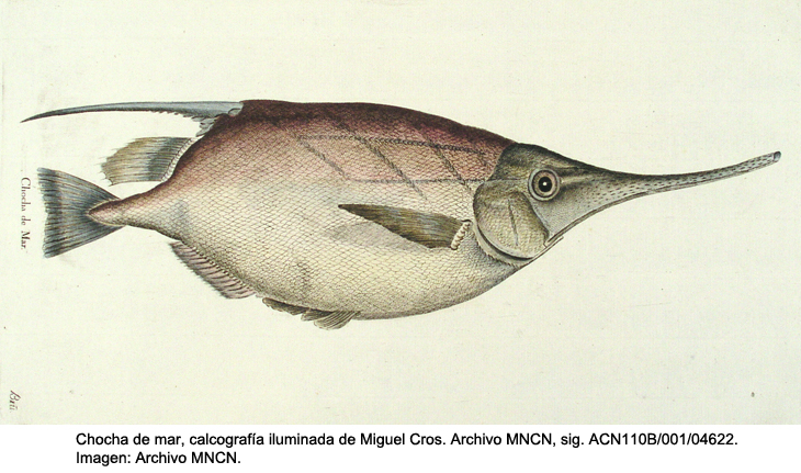 Bucear en el Archivo MNCN puede revelarnos historias sorprendentes como El dibujante de peces Miguel Cros y la impostura de Juan Bautista Bru. Al final del reinado de Carlos III, el conde de Floridablanca, entonces Secretario de Estado, encargó al Comisario de Guerra de Marina Antonio Sáñez Reguart un informe sobre la situación y necesidades de las pesquerías españolas para aumentar el número de capturas, ya que habían disminuido. Había que sustituir la importación de pescado por otros peces procedentes de nuestros mares, en una época en la que España carecía de obras sobre la fauna de sus costas, a excepción de Cataluña y Galicia. Sáñez elaboró un tratado sobre los peces de la España peninsular, para el que contó con las magníficas ilustraciones del pintor Miguel Cros. En 1773 escribió a Floridablanca para proponerle hacer una obra ilustrada de las producciones marítimas de España, acompañando la carta de un cuaderno con dibujos de peces recién sacados del mar, donde comenta que los dibujos se han mostrado a los pescadores, que los reconocieron por su nombre, admirados de la exactitud de los dibujos; al ver el cuaderno, el rey aprobó el proyecto. Sáñez y Cros viajaron por las costas españolas entre 1783 y 1787: Cros dibujaba los peces y Sáñez los describía. En ese período, Cros dibujó y coloreó 314 aguadas de fauna marina de las costas de Cantabria y 183 del Mediterráneo y golfo de Cádiz. Las aguadas eran tan buenas que Floridablanca dispuso que los dibujos fueran grabados e iluminados en la recién creada Real Calcografía. El encargo recayó en Juan Bautista Bru, disecador del Real Gabinete, que no dudó en apropiárselos, dado que no estaban firmados, haciendo estampar su nombre en muchas de las matrices de cobre. Aunque Bru fue desenmascarado inmediatamente por José Clavijo, director del Real Gabinete, solo a partir de las investigaciones de López Linage y Juan Carlos Arbex se ha sabido que Cros fue el verdadero artífice de los dibujos. Aun así, en muchas de las biografías y catálogos, Bru sigue figurando como autor de las aguadas y los grabados.