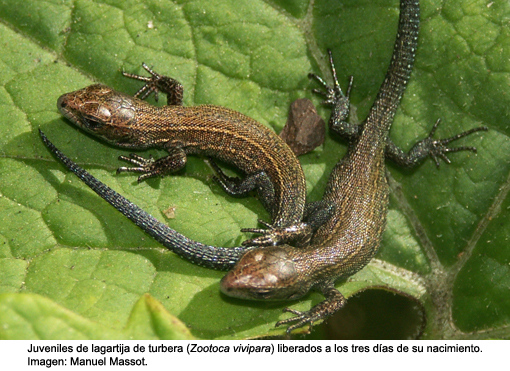 La lagartija de turbera Zootoca vivipara, a diferencia de otros lacértidos, es ovovivípara, dando puestas con juveniles vivos ya desarrollados. Al igual que ocurre en otras especies de reptiles, esta pequeña lagartija insectívora crece sin los cuidados parentales por lo que las lagartijas recién nacidas se enfrentan al gran reto que supone conseguir su primera comida, ya sea un insecto o una araña, sin la ayuda de sus padres.
