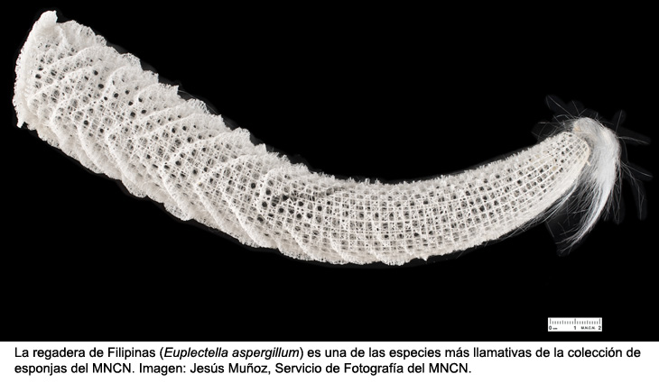 La regadera de Filipinas es una de las especies más llamativas de la colección de esponjas del MNCN. Se conservan tres ejemplares, de los cuales dos proceden, según el historiador del Museo Agustín J. Barreiro, de la colección particular del profesor Graells, donada por su yerno a la muerte del sabio naturalista. También existen dos preparaciones microscópicas de 1911 y 1912, esta última de la Estación de Biología Marina de Santander. Las dos preparaciones proceden de ejemplares colectados por Francisco Ferrer Hernández, un gran especialista en esponjas que trabajó en esa época en el Museo.