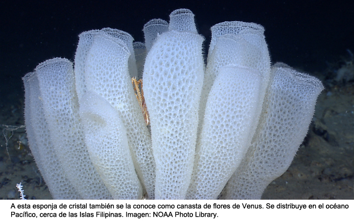 La canasta de flores de Venus o esponja de cristal (Euplectella aspergillum), como también se la llama, es un bello porífero que se ancla en el fondo marino gracias a su peculiar esqueleto, que es extraordinariamente flexible. Pertenece al grupo de las hialoesponjas, esponjas vítreas o esponjas de cristal (clase Hexactinellida) y fue descrita en 1841 por el gran zoólogo inglés Richard Owen (1804-1892), quién hablaría de ella como una de las más singulares, bellas y raras producciones marinas de las Islas Filipinas.