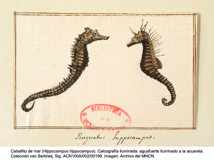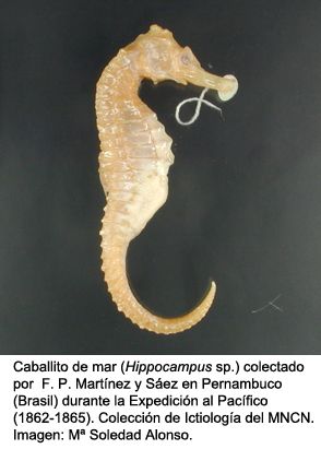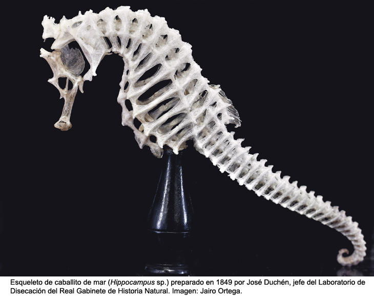 La Colección de Ictiología del Museo alberga 86 especímenes de Hippocampus, de los cuales 82 se conservan en etanol al 70%. Uno de estos especímenes conservados en alcohol fue colectado por Francisco de Paula Martínez y Saéz en Pernambuco (Brasil) durante la Expedición Científica al Pacífico (1862-1865).También hay tres ejemplares naturalizados, dos de los cuales pertenecen a la colección histórica, ya que muy probablemente fueron colectados en el siglo XIX. Por último, un ejemplar muy interesante es el esqueleto montado por José Duchén en 1849, que por aquel entonces era el jefe del Laboratorio de Disecación del Real Gabinete de Historia Natural.
