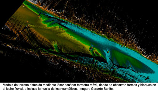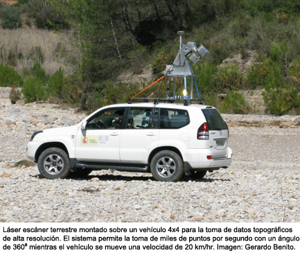 Nosotros estamos ahora desarrollando una serie de proyectos donde aplicamos el Láser Escáner Terrestre, que nos permite conseguir información topográfica muy precisa, con una escala de resolución de milímetros, y además con una cantidad de datos impresionante. Antes estos datos se tomaban desde un avión pero ahora se pueden tomar desde tierra, para lo cual se posiciona una estación con un láser que anota datos topográficos de millones de puntos del entorno por segundo. Nosotros hemos querido ir más allá y hemos montado un sistema de láser de este tipo sobre un vehículo. Nos movemos por el río y el sistema corrige en tiempo real la posición del vehículo y toma miles de datos por segundo de lo que sería la topografía del río. Esto se puede hacer todos los años y ver cómo se va moviendo el sedimento y estimar la cantidad de sedimento que se va generando.