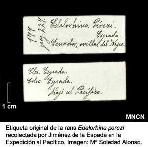 La colección de anfibios reunida por la Comisión Científica del Pacífico (1862-1865) tiene un valor extraordinario, tanto histórico como científico. El Museo Nacional de Ciencias Naturales (MNCN-CSIC) conserva 522 ejemplares recolectados por el gran zoólogo español Jiménez de la Espada, gran parte de los cuales han servido para describir la fauna herpetológica sudamericana.