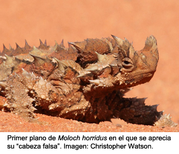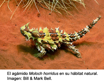 Haciendo honor a su nombre el diablo espinoso (Moloch horridus) posee numerosas espinas que cubren su cuerpo, desde la cabeza a la cola. Este saurópsido pertenece a la familia Agamidae, muy próxima a las iguanas. No resulta fácil verlo ya que se camufla muy bien gracias a su coloración críptica y a las formas sinuosas que le proporcionan las espinas, especialmente cuando permanecen inmóviles. Su color varía con la temperatura, pasando del marrón u oliva de las mañanas, cuando están fríos, al amarillo por la tarde, cuando aumenta la temperatura y están más activos.