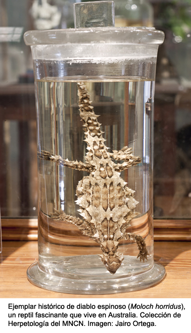 En el Museo puede verse un espécimen citado en las actas de la Sociedad de Historia Natural de 1874. El saurio fue presentado por Francisco de Paula Martínez y Sáez (1835-1908), miembro de la Comisión Científica del Pacífico; este catedrático de zoología era responsable de la colección de vertebrados del Museo. En su presentación, Martínez y Sáez citó la descripción del reptil que hizo el benedictino Rosendo Salvado en sus Memorias Históricas sobre la Australia publicadas en 1851. El fraile comentaba que a pesar del horrible aspecto del diablo de los bosques, como lo llamaban los colonos, o minchin, como lo conocían los indígenas australianos, era inofensivo, siempre y cuando se tuviese cuidado para no clavarse las agudas espinas de las que estaba armado su cuerpo.