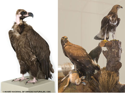 (Derecha) un diorama de Águilas Reales Aquila chrysaetos realizado a principios de siglo por los hermanos Benedito.